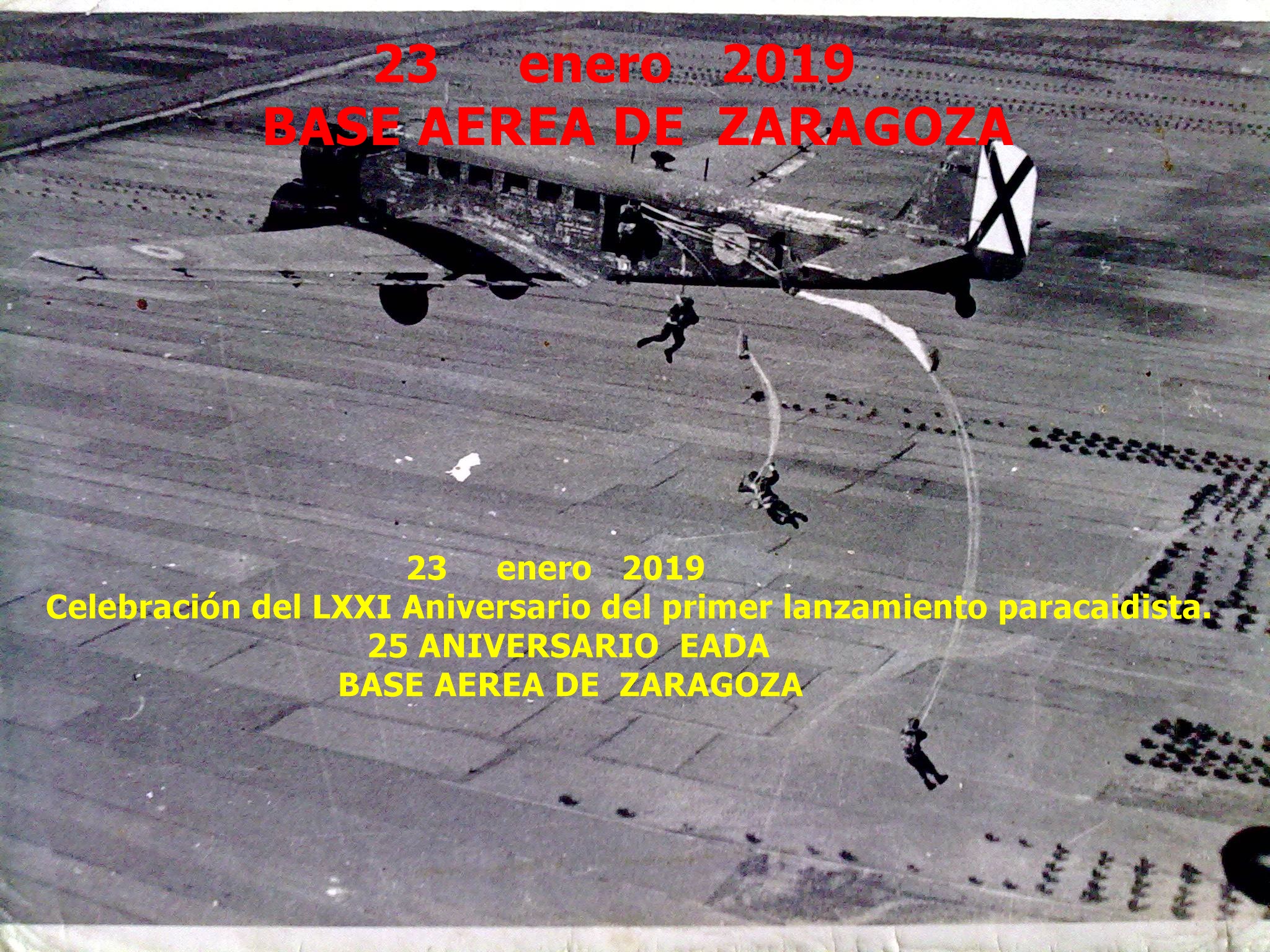 Dentro de las actividades previstas para el primer semestre de 2019 la primera de ellas se llevará a cabo el próximo día 23 de enero en la BASE AEREA DE ZARAGOZA con motivo del LXXI Aniversario del Primer Lanzamiento Paracaidista y coincidiendo con el XXV Aniversario de la creación del Escuadrón de Apoyo al Despliegue Aéreo (EADA)