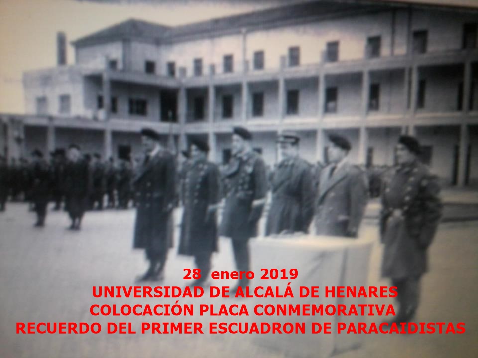 Como segunda actividad al primer semestre de 2019 el próximo día 28 de enero, con motivo del LXX Aniversario del Primer Lanzamiento en la que fue la base de la Primera Bandera de Paracaidistas y Primer Escuadrón de Paracaidistas en Alcalá de Henares un acto en la Universidad, Facultad de Ciencias que en su día fue el edificio del Primer Escuadrón, donde se va a colocar una placa en recuerdo de lo que en su momento fueron esas dependencias y espacios. La mencionada placa corre a cargo de la ASVEPAREA.